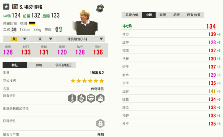 埃芬博格擅长进攻,他的远射在当时是一绝,爆抽经常让门将来不及反应,所以深受职业选手喜爱。防守时,埃芬博格依靠庞大身体完成卡位,或者提前预判传球路线进行拦截。埃芬博格的手感比巴拉克灵活一些,拥有很好的底板。