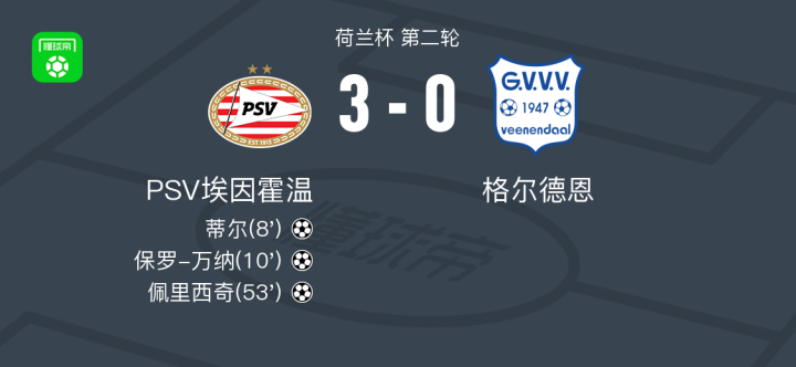 北京时间12月17日荷兰杯 第二轮,PSV埃因霍温对阵格尔德恩。PSV埃因霍温蒂尔破门,保罗-万纳破门,佩里西奇破门。最终比分PSV埃因霍温 3-0 格尔德恩。