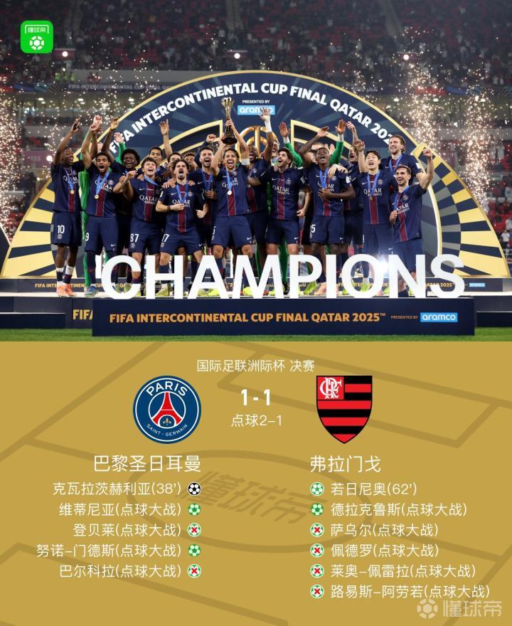 北京时间12月18日国际足联洲际杯 决赛,巴黎圣日耳曼对阵弗拉门戈。上半场杜埃传中,罗西失误没把球扑远,克瓦拉茨赫利亚破门。下半场德阿拉斯卡埃塔造点,若日尼奥主罚命中。加时赛双方均无建树,点球大战萨福诺夫4次扑点。最终巴黎总分3-2点杀弗拉门戈夺得洲际杯冠军。
