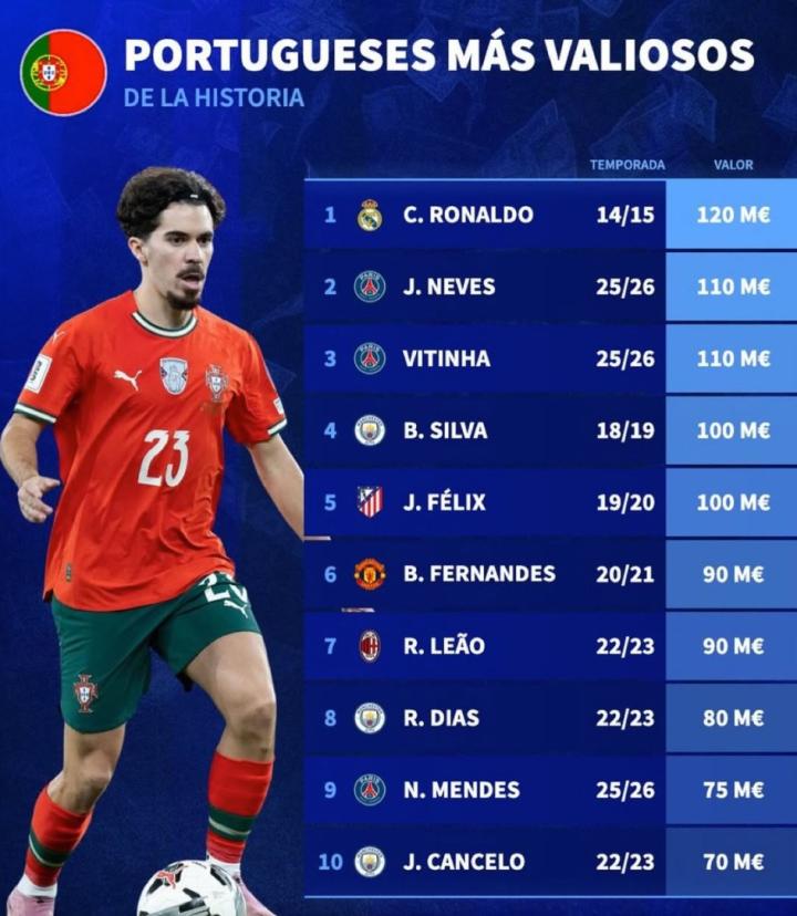 德转葡萄牙球员历史身价TOP10:C罗、内维斯、维蒂尼亚前3