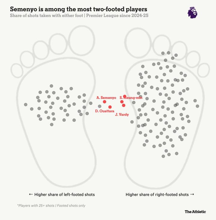 由于他的双脚均衡能力,对手的防守变得更加复杂。如果我们观察自2024-25赛季以来球员的射门脚分布,塞门约可能是联赛中最“双足皆能”的球员。