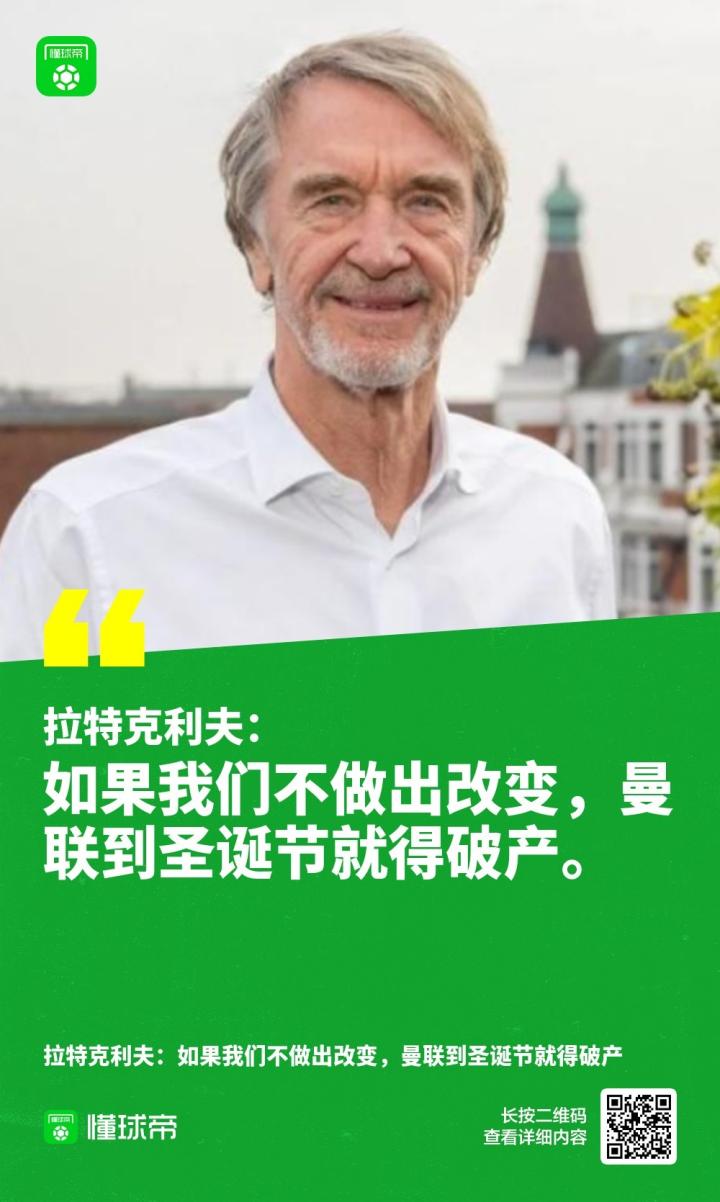 今年3月,曼联陆续被曝出一系列在财政领域“开源节流”的举措,包括但不限于取消员工午餐、退租办公室、收回季票持有者座位、大规模裁员等。其中不少行为严重触及了工作人员和球迷的利益,这让上述举措的推行者拉特克利夫爵士深陷舆论漩涡。为向球迷澄清俱乐部的困难,拉特克利夫接受了英国名记采访,声称曼联的财政状况已经十分糟糕,如果再不做出改变就要在圣诞节前破产。