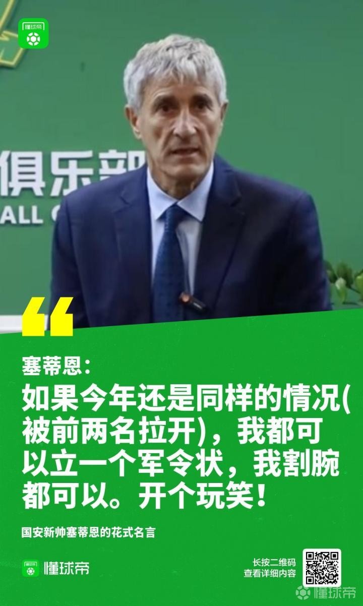 今年年初,曾执教过巴萨的西班牙名帅塞蒂恩空降北京国安。赛季开始前,塞蒂恩踌躇满志地接受媒体专访。当被问及如何看待北京国安上赛季与上海双雄分差过大时,塞蒂恩表示以今年球员的水平看,绝对不会和榜首球队拉开如此大的分差。他说道:“如果说我今年还是同样的情况的话,我都可以去给你立一个军令状,我割腕都可以。开个玩笑!”