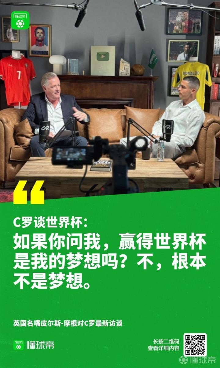 今年11月初,C罗时隔三年再次接受皮尔斯-摩根采访。本次采访中最为火爆的言论便是C罗谈自己如今对世界杯的看法。C罗表示如今世界杯对他来说根本不算梦想了,因为是否赢得世界杯已经不会影响他在足坛的地位,现在他最想做的就是享受当下。