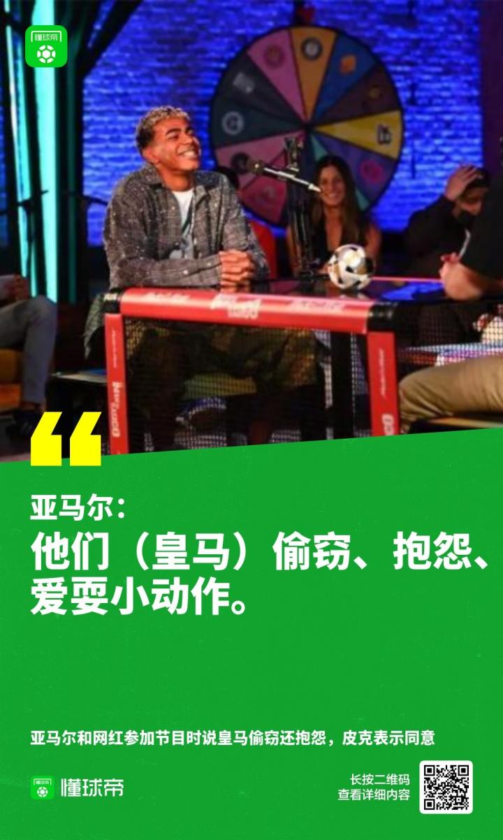 本赛季首次西班牙国家德比前,巴萨球星亚马尔做客皮克国王联赛节目,接受访谈时发表了一番针对皇马的讽刺性言论。在和网红的对谈中,亚马尔直言皇马喜欢偷窃和抱怨,对此皮克也表示同意。