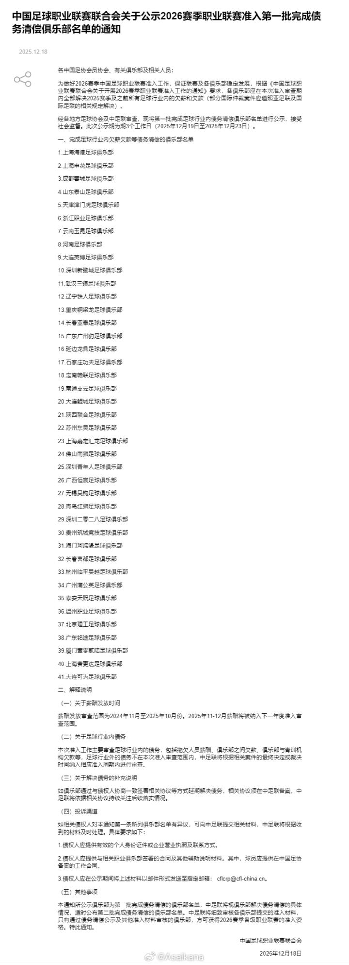 中足联公示了2026赛季中国足球职业联赛准入第一批清欠名单Asaikana @懂球帝2025-12-18 20:44中足联公示了2026赛季中国足球职业联赛准入第一批清欠名单。北京国安、青岛西海岸、青岛海牛、梅州客家、南京城市、广西平果、江西庐山、兰州陇原竞技、山西崇德荣海、赣州瑞狮不在这一批名单中。展开更多