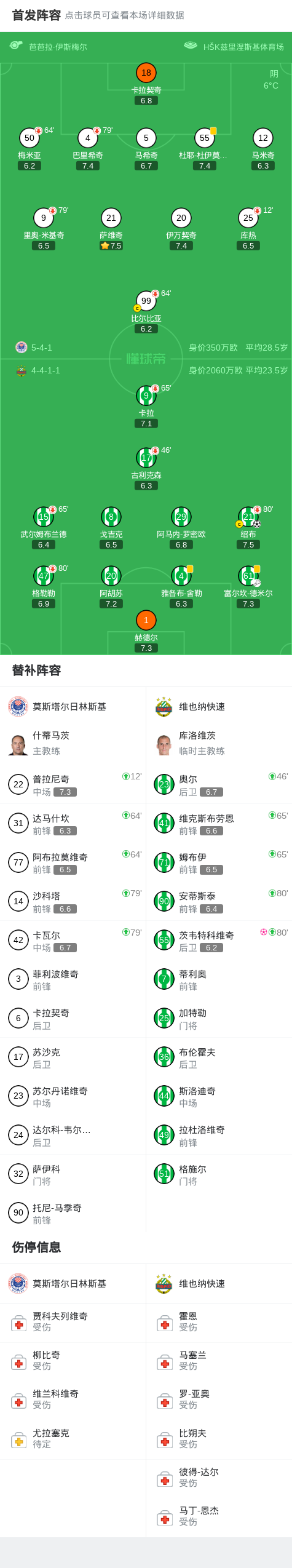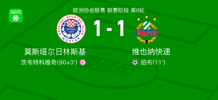 北京时间12月19日欧洲协会联赛 联赛阶段 第6轮,莫斯塔尔日林斯基对阵维也纳快速。维也纳快速绍布破门,茨韦特科维奇自摆乌龙。最终比分莫斯塔尔日林斯基 1-1 维也纳快速。