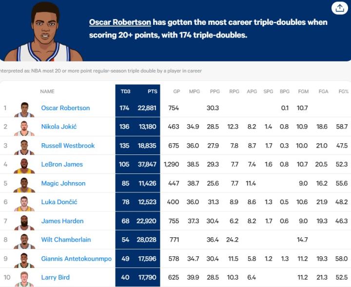 据统计,这是约基奇职业生涯第136次20+得分三双,他也正式超越威少,独享这项纪录的历史第二。排在第一的是奥斯卡-罗伯特森,他目前以174次领跑,按约基奇的三双效率超越罗伯特森指日可待。