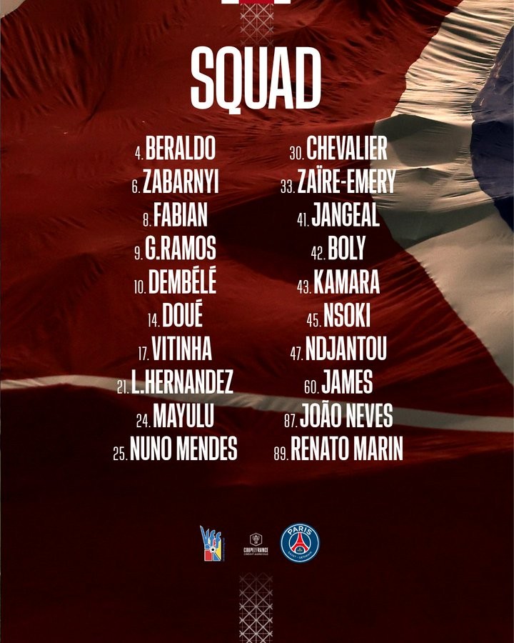 中场:8-法比安-鲁伊斯、17-维蒂尼亚、24-马尤卢、33-扎伊尔-埃梅里、41-让热亚尔、45-恩索基、87-若昂-内维斯