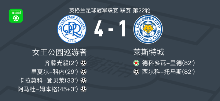 北京时间12月20日,英格兰足球冠军联赛第22轮,女王公园巡游者主场迎战莱斯特城。比赛开局阶段,伯勒尔送出助攻,齐藤光毅破门得分,为女王公园巡游者取得领先。随后,里夏尔-科内攻入一球,进一步扩大优势。不久之后,伯勒尔再次完成助攻,卡拉莫科-登贝莱破门,球队在上半场建立起三球领先。上半场补时阶段,吉米-邓恩助攻阿马杜-姆本格头球破门,将比分改写为4比0。易边再战,莱斯特城获得点球机会,但德科多瓦-里德主罚未能命中。比赛尾声,西尔科-托马斯破门,为莱斯特城扳回一城。最终全场比赛结束,女王公园巡游者以4比1战胜莱斯特城。