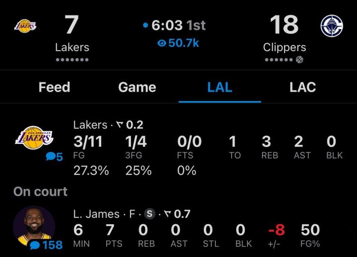 首节过半,快船队打了湖人一个18-7,湖人全队都陷入挣扎,这7分也全部由勒布朗-詹姆斯所得。首节战罢,快船28-15领先。