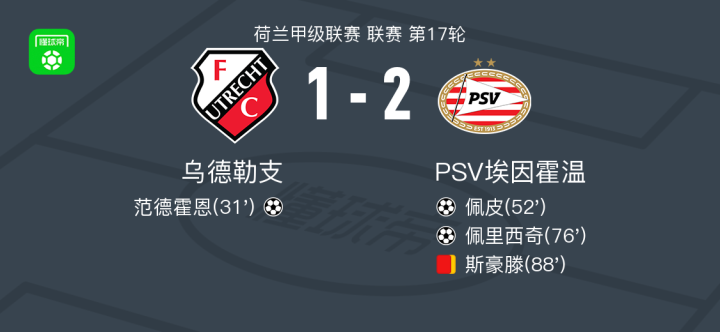PSV埃因霍温2-1逆转乌德勒支,佩里西奇、佩皮破门