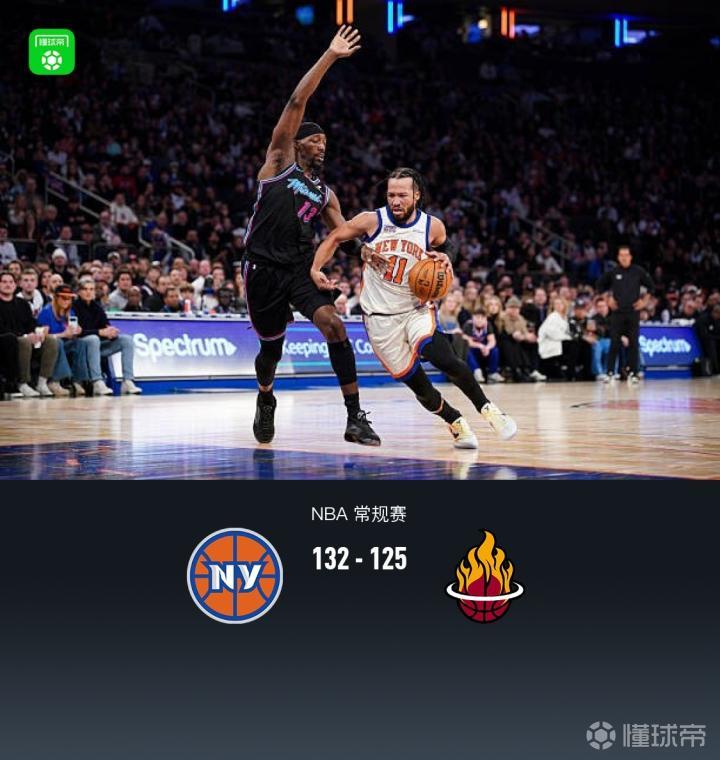 第四节尼克斯布伦森拿下8分,热火阿德巴约拿下8分,最终尼克斯132-125战胜热火