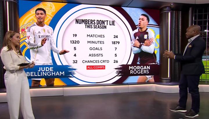 主持人:在英格兰,关于谁该担任‘三狮军团’10号的讨论非常激烈。是贝林厄姆,还是摩根-罗杰斯?我们可以看看两人本赛季各项赛事的各项数据对比:效力于皇家马德里的贝林厄姆贡献了5球4助攻,并创造了32次机会;而摩根-罗杰斯则是7球5助攻,创造了26次机会。我不知道你如何看待这些数据,但考虑到这两个人的特点以及英格兰中场的具体需求,你认为谁该成为英格兰队的10号?