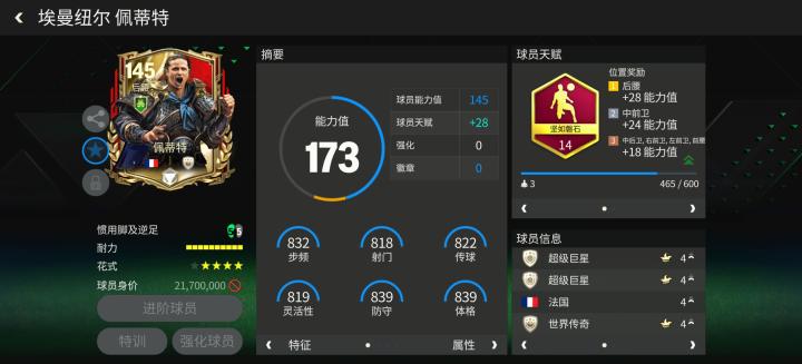 三国·群雄逐鹿佩蒂特配备了坚如磐石天赋,基础花式为高级油炸丸子,搭配10格耐力,他可谓是攻守全能的顶级后腰。实战中,佩蒂特虽然主动前插积极性不高,但他能利用高级油炸丸子花式连续摆脱,作为中场持球点策动进攻。防守端,佩蒂特超高的跑动积极性让他防守覆盖面积远超其他球员,中场存在感十足。