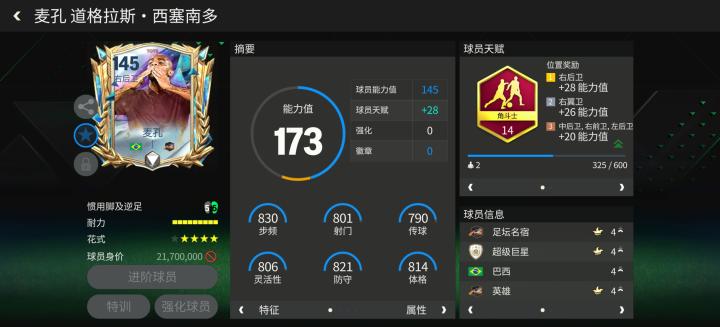 25赛季最佳麦孔司职右后卫,配备了角斗士天赋,马赛回旋搭配四星花式星级确保了他的边路持球进攻能力。麦孔速度极快,边路攻守参与度俱佳。在前场,他能送出高度出色的传中,助攻队友完成得分;攻守转换时,他又能及时回防落位,确保球队边路防守稳定;阵地防守时,他的防内切卡位也相当硬朗
