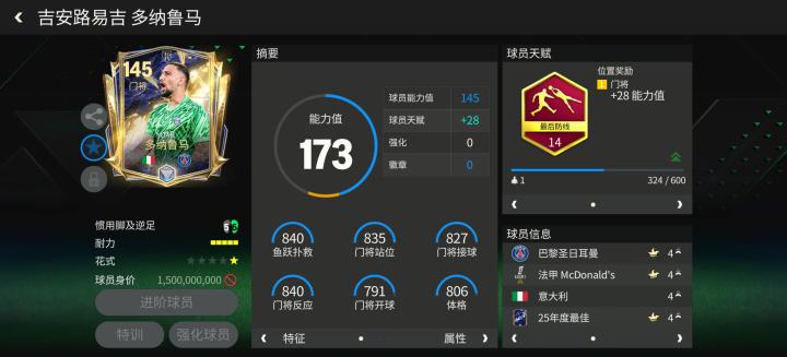 多纳鲁马是游戏内最热门的现役门将,他的身材高大,门线技术扎实,面对对手的爆射和搓射,他都能做出极快的扑救,化解对手的威胁打门。防角球和传中时,多纳鲁马也总能及时出击,利用拳击球完成解围。