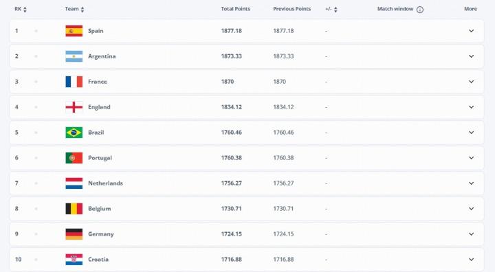 世界排名前十名分别是西班牙、阿根廷、法国、英格兰、巴西、葡萄牙、荷兰、比利时、德国与克罗地亚。