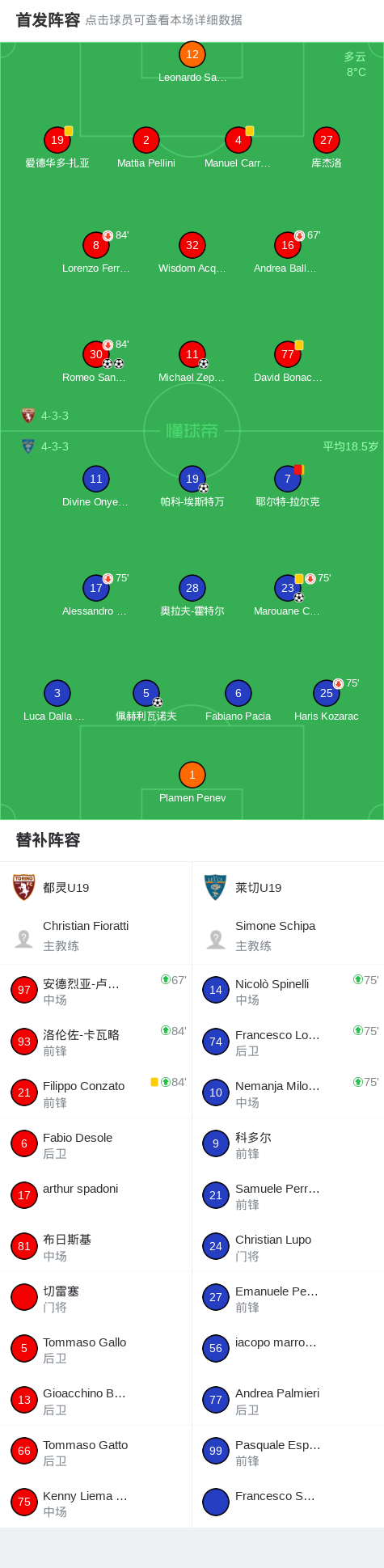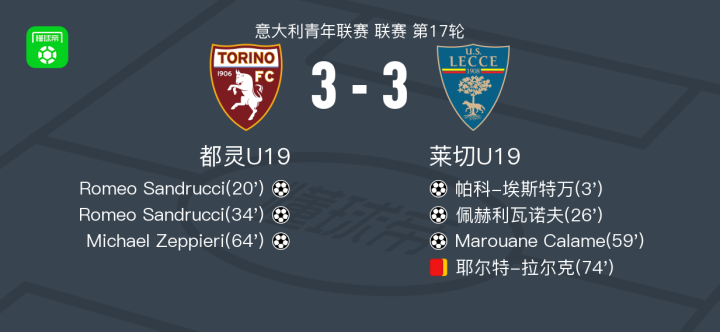 北京时间12月22日意大利青年联赛 联赛 第17轮,都灵U19主场对阵莱切U19。都灵U19Romeo Sandrucci梅开二度,Michael Zeppieri破门。莱切U19帕科-埃斯特万破门,佩赫利瓦诺夫破门,Marouane Calame破门。最终比分都灵U19 3-3 莱切U19。