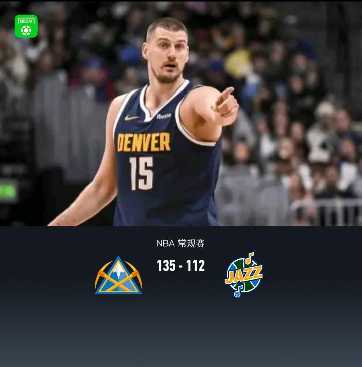 掘金四人20+以135-112大胜爵士,约基奇14+13+13,马尔卡宁27+8