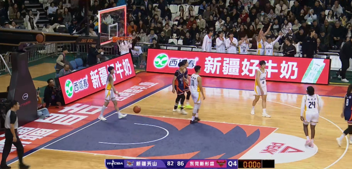 叫了暂停,广东女篮发边线球,新疆女篮防守沟通出现失误,于是广东女篮的外援科利尔在篮下被放空,接球之后转身命中了上篮,帮助球队以86比82领先4分,基本杀死比赛胜负悬念。