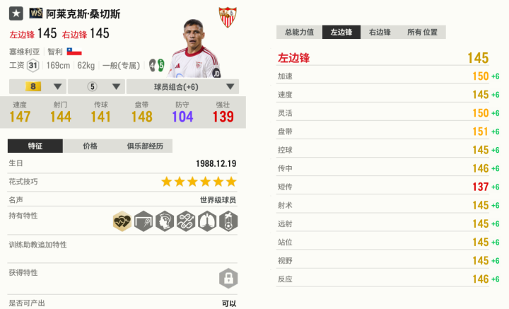 在持球时,桑切斯个子小、起速快,脚步很轻盈,对方后卫难以直接完成抢断。等他杀入禁区,就可以尝试侧身ZD,桑切斯的搓射是一绝。桑切斯体能充沛,可以支持多轮次高速带球,不用担心下半场跑不动。