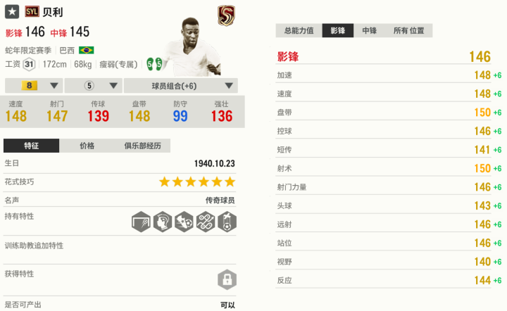 贝利常用于中锋,但他除了传中一般,其他特点也适合打边锋。贝利有灵活的身材优势,能在边路和肋部寻求突破机会,他面对多人包夹也能“游龙”突破。