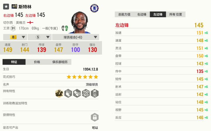 斯特林之前一直没有很好的卡可用,直到WS赛季,他迎来了最好的版本。WS斯特林十分擅长内切,他有着非常灵活的盘带,变向很丝滑,就能掌握突破的主动性。斯特林最大优势是速度,他能在低速时蹭一下蹿出去,这一招在内切时很有效。