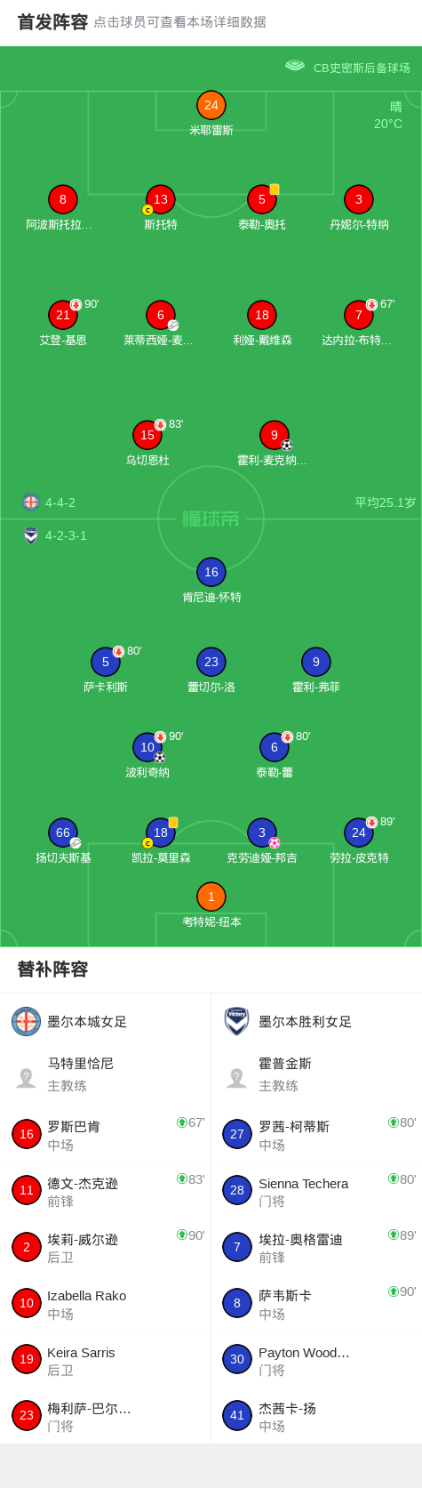 北京时间12月23日,澳大利亚女子足球A联赛 第10轮,墨尔本城女足主场迎战墨尔本胜利女足。比赛中,墨尔本胜利女足由波利奇纳接扬切夫斯基助攻率先取得进球。随后,克劳迪娅-邦吉不慎自摆乌龙,为对手送上一分。比赛后段,莱蒂西娅-麦克纳送出助攻,霍利-麦克纳马拉破门得分,帮助球队实现反超。最终全场比赛结束,墨尔本城女足以2-1战胜墨尔本胜利女足。