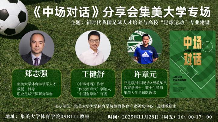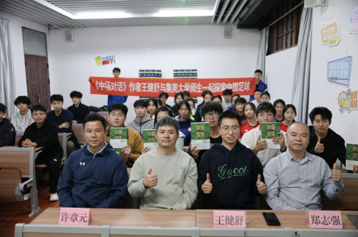 2025年11月28日,资深体育人、“中国金球奖”特邀评委王健舒做客集美大学,开展《中场对话》主题分享会,分享著作创作背后的故事,深度剖析中国足球发展脉络。本次分享会由集美大学足球队教练许章元博士主持,体育学院博士生导师、职业足球资深研究学者郑志强教授担任特邀嘉宾,现场师生互动踊跃,氛围热烈。