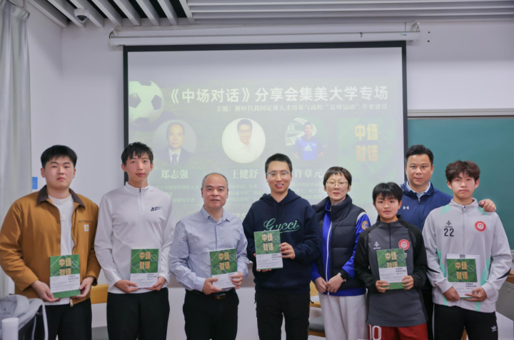 分享会尾声,王健舒为四名踊跃提问的学生赠送亲笔签名著作,并与在场师生合影留念。此次分享会不仅让集美大学师生深入了解了《中场对话》书中的精髓,更通过前沿热点话题交流分享,为足球运动研究与实践注入了新思考。