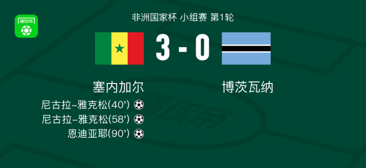 北京时间12月23日非洲国家杯 小组赛 第1轮,塞内加尔对阵博茨瓦纳。塞内加尔尼古拉-雅克松梅开二度,恩迪亚耶破门。最终比分塞内加尔 3-0 博茨瓦纳。