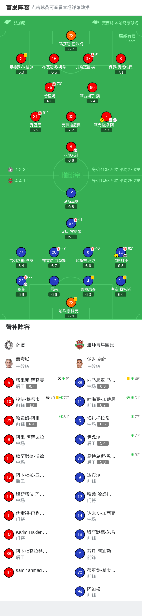 北京时间12月24日亚足联冠军精英联赛 联赛阶段 第6轮,萨德对阵迪拜青年国民。萨德拉法-穆希卡帽子戏法,塔里克-萨勒曼破门。迪拜青年国民卡塔维亚破门,叶海亚-加萨尼破门。最终比分萨德 4-2 迪拜青年国民。