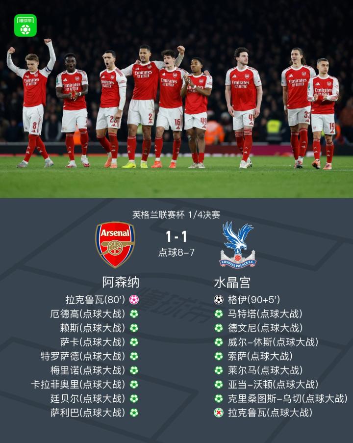 英联杯阿森纳9-8点杀水晶宫晋级四强,拉克鲁瓦乌龙+失点