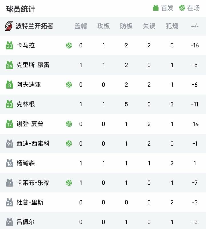 表现独一档,杨瀚森是开拓者全队上半场唯一正负值为正的球员