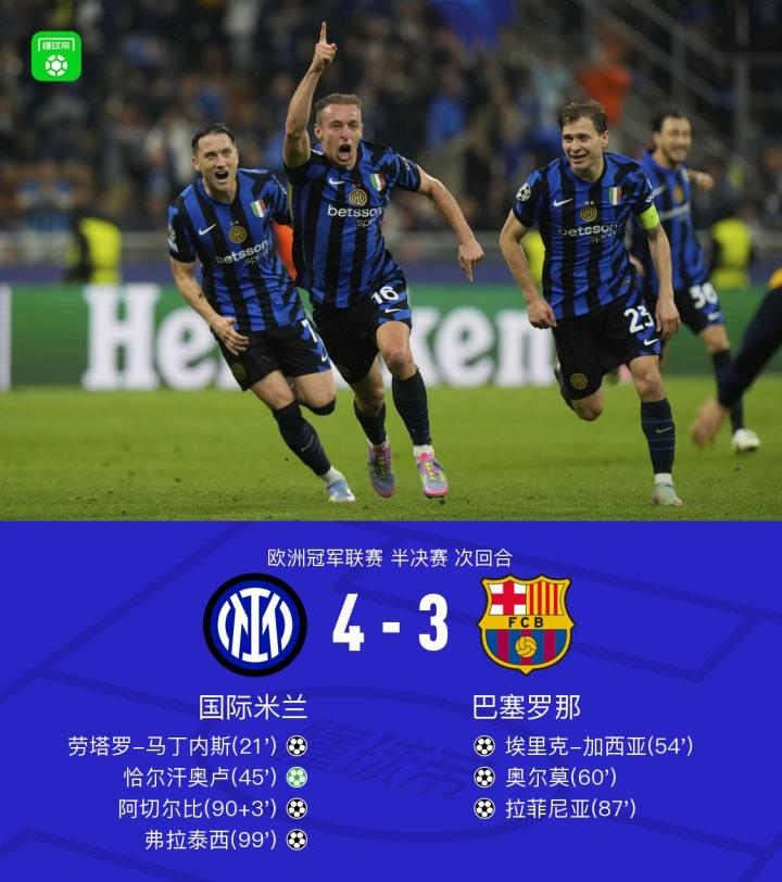 【国米两回合7-6巴萨艰难晋级欧冠决赛,弗拉泰西加时赛制胜】