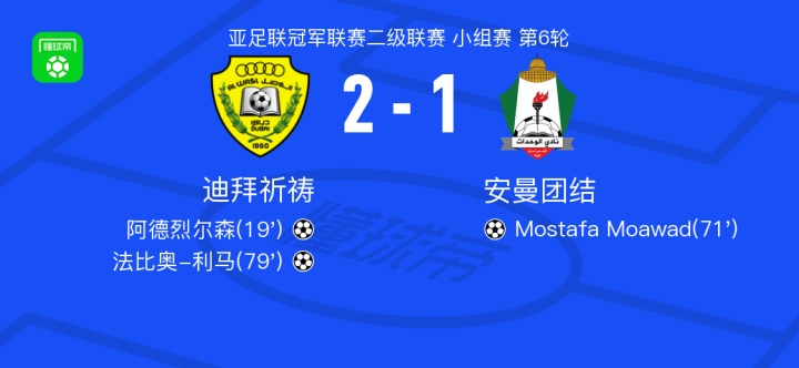 迪拜祈祷2-1安曼团结,法比奥-利马、阿德烈尔森破门