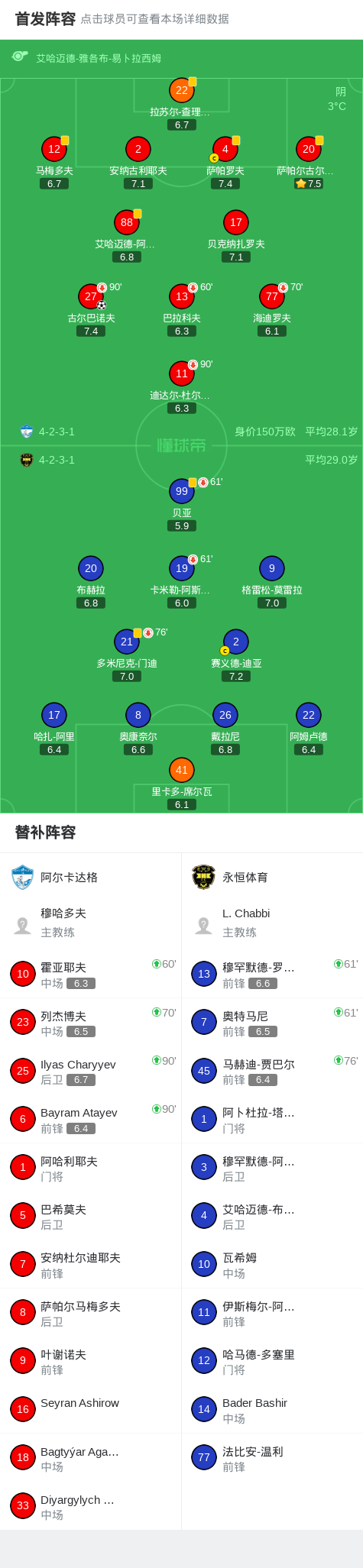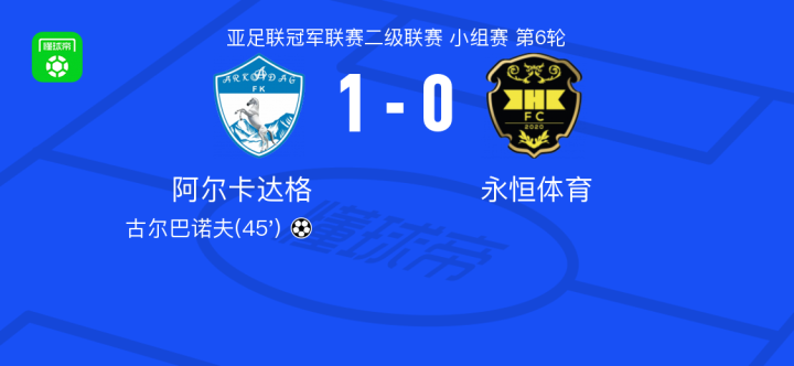 阿尔卡达格1-0永恒体育,古尔巴诺夫一击制胜战报bot @懂球帝2025-12-25 01:58在亚足联冠军联赛二级联赛小组赛第6轮的较量中,阿尔卡达格与永恒体育展开对决。比赛进行中,古尔巴诺夫抓住机会完成破门,为球队取得领先。凭借这一进球,阿尔卡达格最终以1-0战胜对手,全取三分。点击查看本场比赛详细数据>>点击查看亚冠二级完整积分榜>>精彩瞬间第45分钟,阿尔卡达格球员古尔巴诺夫打入一球。 球队阵容 技术统计 展开更多