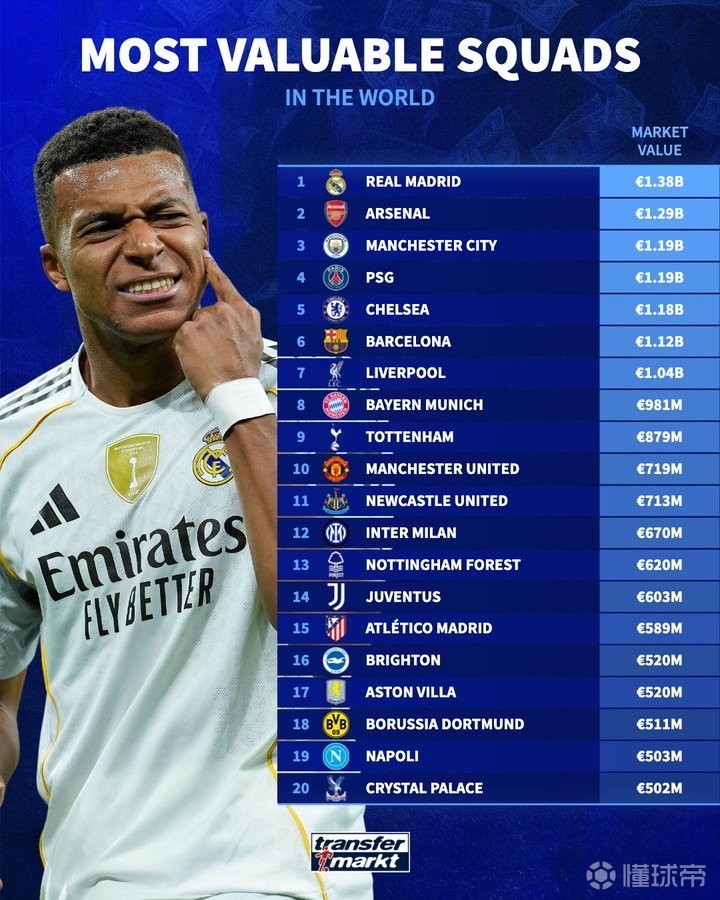 【德转列总身价最高球队排名:皇马13.8亿欧居首,阿森纳第二】