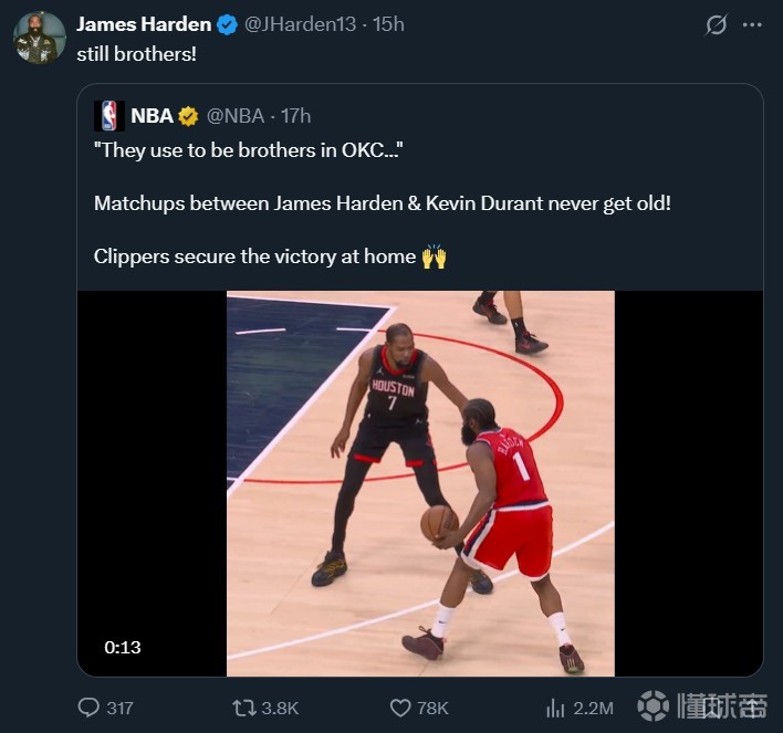 NBA官媒称哈登杜兰特曾是雷霆的兄弟,哈登转发:现在也是!