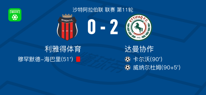 北京时间12月26日,沙特阿拉伯职业联赛第11轮展开争夺,利雅得体育坐镇主场迎战达曼协作。比赛中,利雅得体育球员穆罕默德-海巴里被红牌罚下。随后,达曼协作由梅德兰送出助攻,卡尔沃破门得分。比赛进入补时阶段,哈立德-加纳姆助攻威纳尔杜姆再入一球。最终全场比赛结束,利雅得体育0-2不敌达曼协作。
