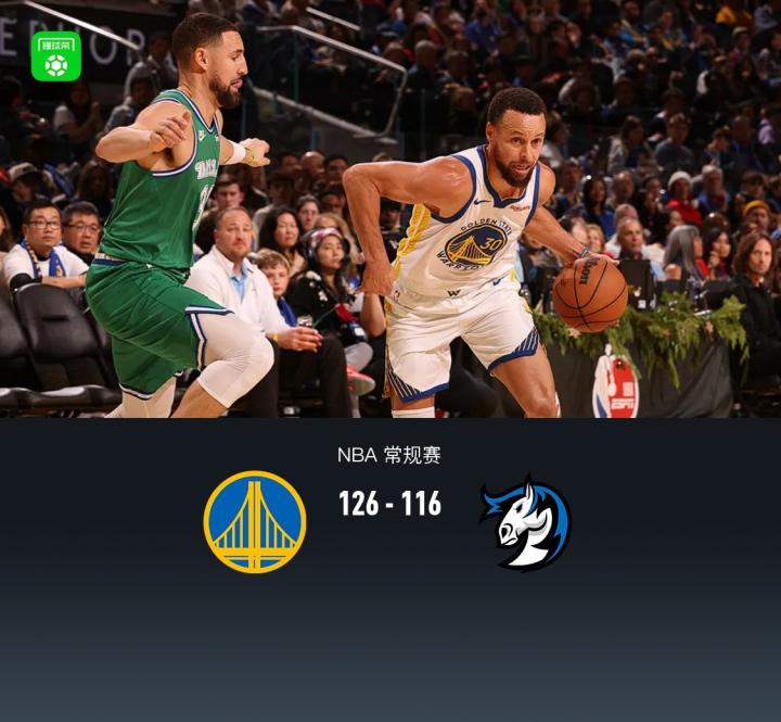 第四节,前半节双方陷入防守拉锯,节中独行侠抓住反击弗拉格、布兰登-威廉姆斯接连冲框追至5分,随队短暂拉锯之后,勇士佩顿空切得分,库里再中三分领先11分,比赛来到最后3分钟,上来独行侠弗拉格、华盛顿相继得分,但勇士梅尔顿、佩顿持续回应,全场结束,勇士126-116独行侠。