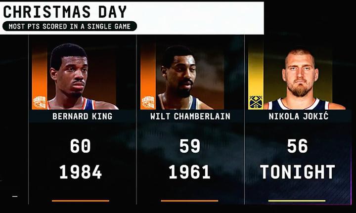 据统计,约基奇砍下的56分在圣诞大战的历史上能排名第三,仅次于伯纳德-金(60分)和威尔特-张伯伦(59分)。此外,约基奇还是NBA历史上首位砍下至少55分15篮板15助攻的球员。