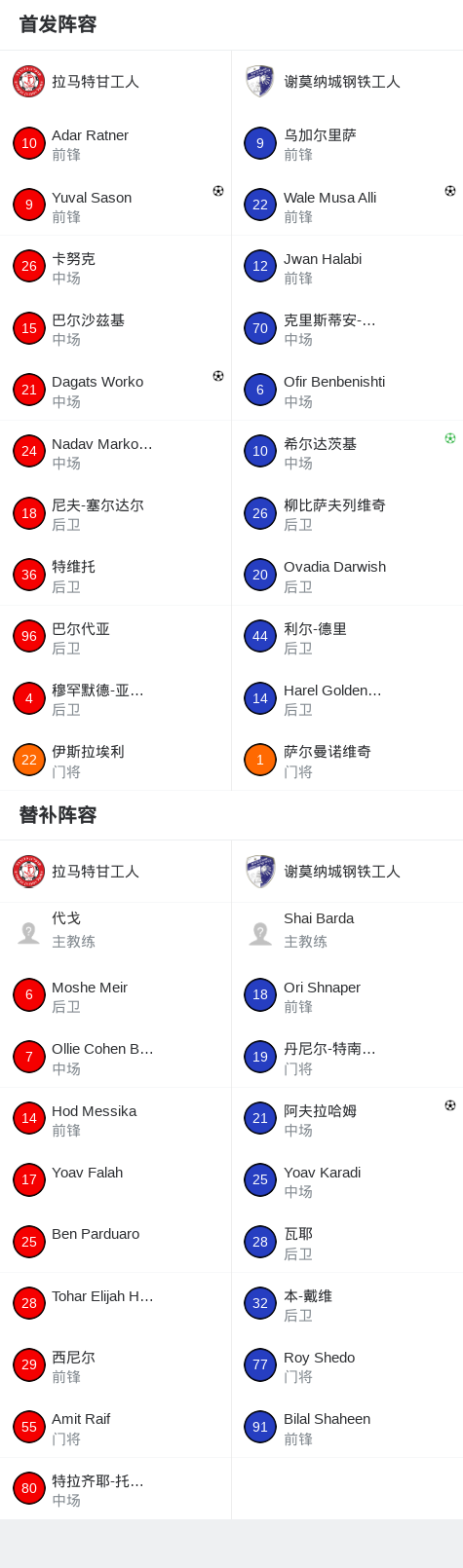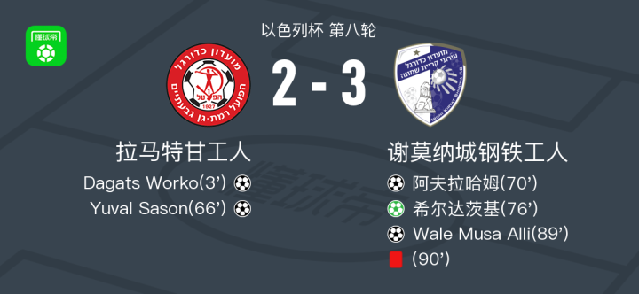 北京时间12月26日,以色列杯第八轮展开较量,拉马特甘工人迎战谢莫纳城钢铁工人。比赛伊始,Dagats Worko为拉马特甘工人首开纪录。随后Yuval Sason再下一城,帮助球队扩大领先优势。落后的谢莫纳城钢铁工人展开反击,阿夫拉哈姆率先为球队扳回一球,紧接着希尔达茨基主罚点球命中,将比分进一步迫近。比赛尾声阶段,Wale Musa Alli攻入关键进球,助谢莫纳城钢铁工人完成逆转。临近结束,谢莫纳城钢铁工人被罚下一人。最终全场比赛结束,比分为2-3。