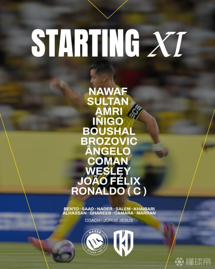 利雅得胜利首发:1-纳瓦夫-阿奇迪、2-苏丹-加奈姆、5-阿姆里、26-伊尼戈-马丁内斯、12-布歇尔、11-布罗佐维奇、20-博尔热斯、21-金斯利-科曼、80-韦斯利-特谢拉、79-菲利克斯、7-C罗