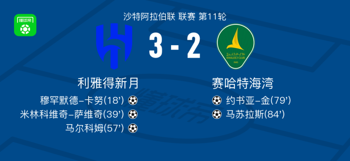 利雅得新月3-2赛哈特海湾,马尔科姆传射,米林科维奇-萨维奇破门