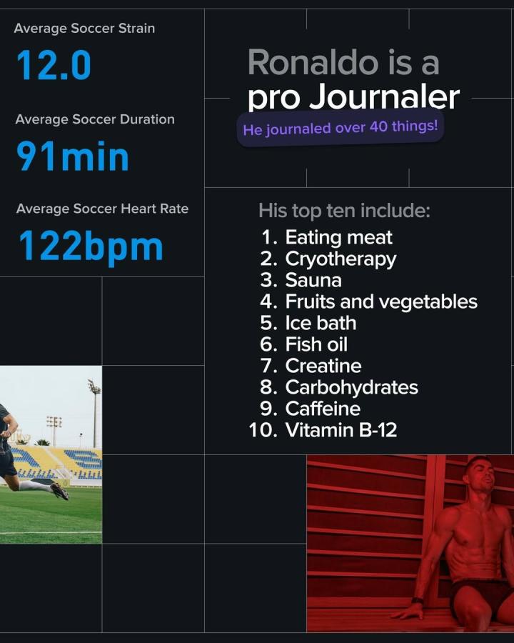 2025年,C罗记录了超过40件事,其中排在前10名的分别是:摄入肉类、冷冻疗法、桑拿、摄入水果和蔬菜、冰浴、摄入鱼油、肌酸、碳水化合物、摄入咖啡因、维生素B12。