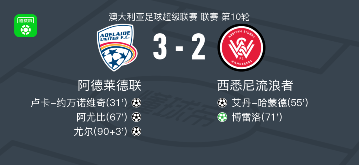 北京时间12月27日,澳大利亚足球超级联赛第10轮,阿德莱德联坐镇主场迎战西悉尼流浪者。比赛中,阿德莱德联率先打破僵局,卢卡-约万诺维奇接杜库利助攻后破门得分。随后西悉尼流浪者由艾丹-哈蒙德在艾丹-西蒙斯的助攻下扳平比分。易边再战,古德温送出助攻,阿尤比冷静施射建功,帮助主队再度领先。客队随后由博雷洛主罚点球命中,将比分再次拉近。比赛进入补时阶段,阿尤比送出关键助攻,尤尔推射得手,为主队锁定胜局。最终全场结束,阿德莱德联以3比2战胜西悉尼流浪者。