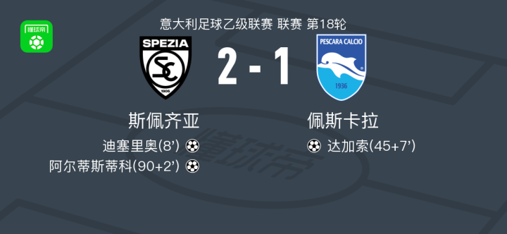 北京时间12月27日意大利足球乙级联赛 联赛 第18轮,斯佩齐亚主场对阵佩斯卡拉。斯佩齐亚迪塞里奥破门,阿尔蒂斯蒂科破门。佩斯卡拉达加索破门。最终比分斯佩齐亚 2-1 佩斯卡拉。