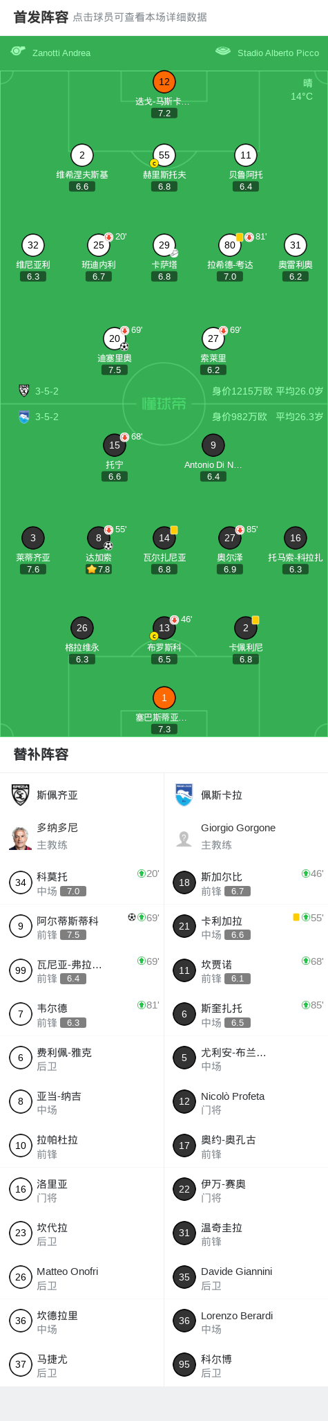 斯佩齐亚2-1佩斯卡拉,阿尔蒂斯蒂科破门,迪塞里奥建功